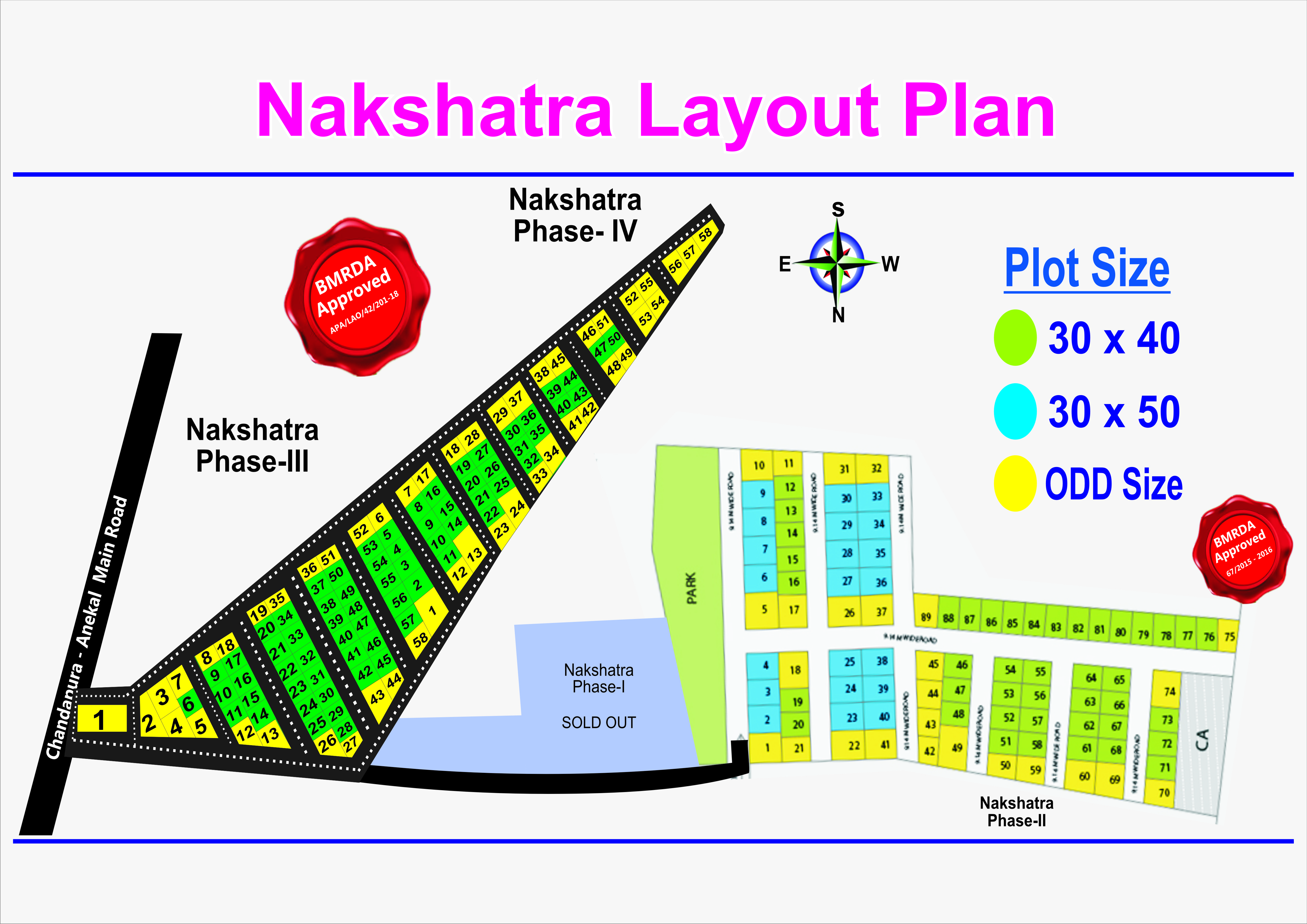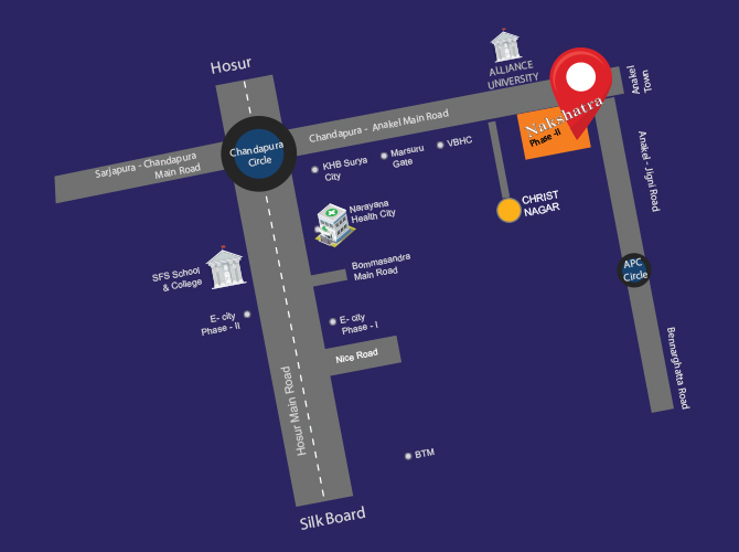 For all who wish for a peaceful life amidst the offerings of a city, Nakshatra Phase II has it all! located on the Chandapura-Anekal Main Road, Nakshatra Phase II knows the need of modern life and gives you the joy of living in expansive open and fresh spaces while remaining in close proximity to Electronic City- The IT Hub. Spread across over 30 acres of space, facing 100 feet main road. Nakshatra Phase II consists of plots of various sizes villa plots. Placed adjacent to the flourishing KHB Surya City and right opposite Alliance University, Nakshatra takes you away from the traffic and pollution, yet, offering close proximity and easy access to Electronic City, Sarjapur Road, Jigani link Road and Bannerghatta Road. We want you to have a peaceful and calm life that, we offer you space to live close to nature, with access to the best schools, hospitals, restaurants etc. We care for you, that we have foreseen the development of the space which makes for a good investment offering you a happy family and secure life!